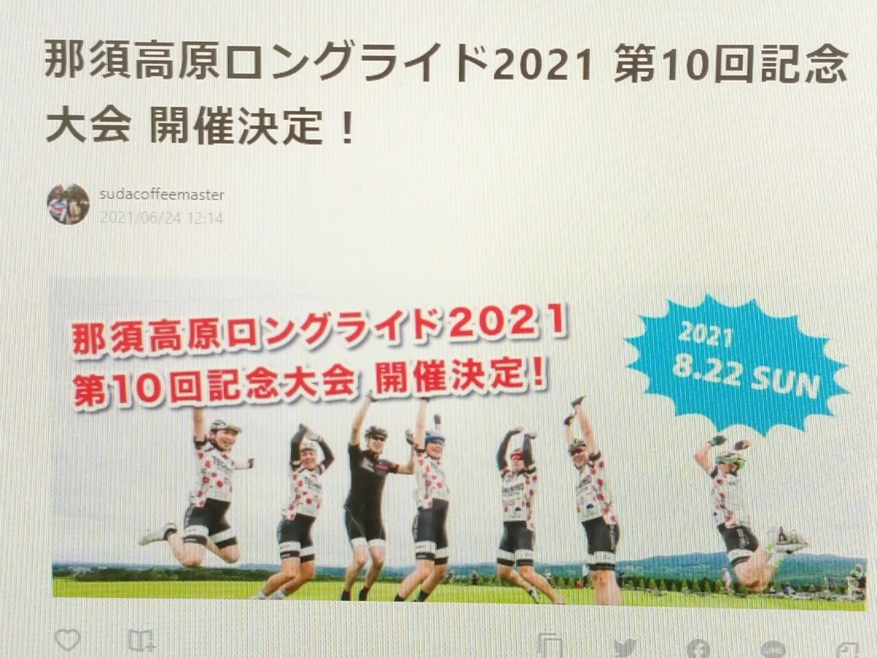 2021年06月27日 那須高原ロングライド開催🚲 8/22(日)に那須高原ロングライドが開催されます🎉7/3(土)20:00〜エントリー開始✨例年の半分の定員(1650名)となりますのでエントリーはお早めに‼️